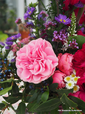 In deze tijd van het jaar brengen de zonnige kleuren van dahlia's en rozen toch nog wat warmte in het leven, ik haal ze bij voorkeur binnen op regenachtige, kille dagen. De letterlijke warmte komt dan van de kachel, maar deze bloemen verwarmen mijn hart. Het huis is weer in herfstsfeer gebracht, alle witte en vrolijk gekleurde kussens en accessoires schoongemaakt en opgeborgen, herfstkleden, warme konijnenvellen enz. tevoorschijn gehaald (voor de goede orde, geen vellen van mijn tuin- konijnen). Ik heb dit keer ook wat ouderwetse koperen spullen van mijn oma naar boven gehaald en glimmend gepoetst met Brasso, haha.